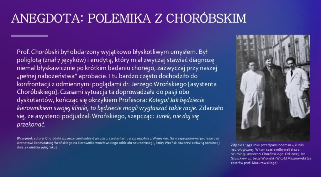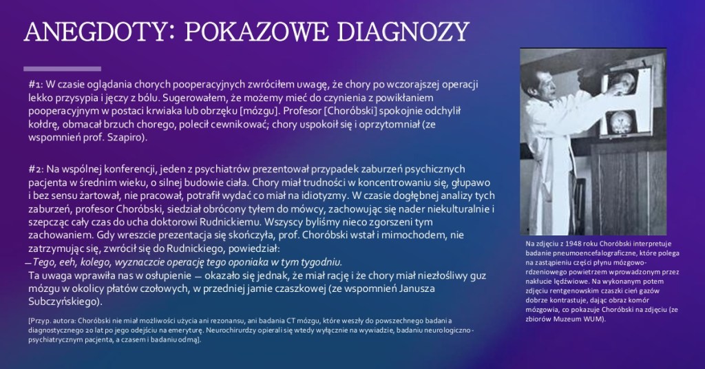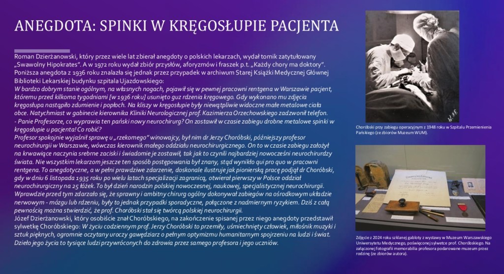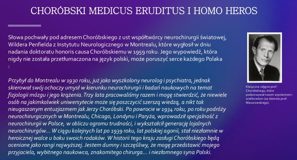 Choć o powstaniu tej książki zrządził przypadek, a przyczyn nieobecności monografii o Jerzym Choróbskim można upatrywać różnorakich, ślad pamięci jego uczestnictwa w początkach neurochirurgii w Polsce i na świecie nie mógł pozostać milczeniem, kiedy ostatni żyjący jego uczeń zbliża się do setnych urodzin. Opowieść o Choróbskim to historia światowej klasy neurochirurga, którego spuścizna nadal tkwi w generacji jego następców. Jego heroizm i umiłowanie ojczyzny w walce o wolną Polskę na przestrzeni XX wieku powinien ujmować i zadziwiać każdego Polaka, bo Choróbski to medicus eruditus, homo heros i amicus alumni [wykształcony lekarz, człowiek bohater i przyjaciel uczniów].