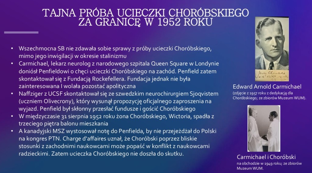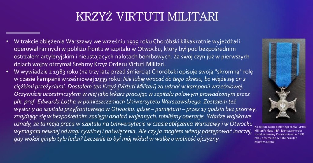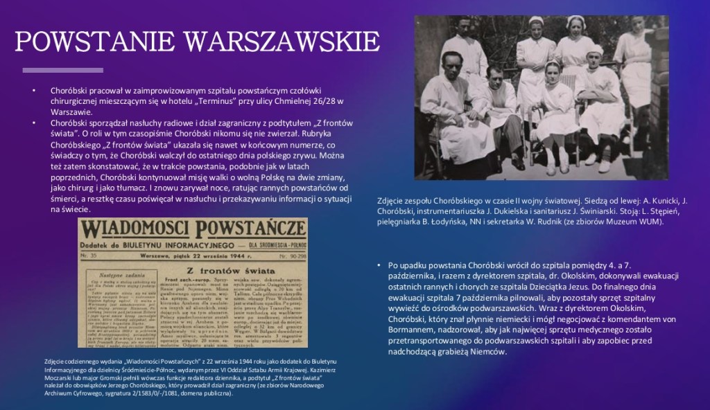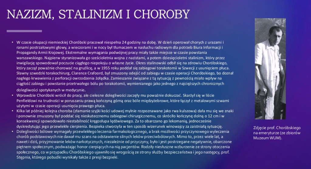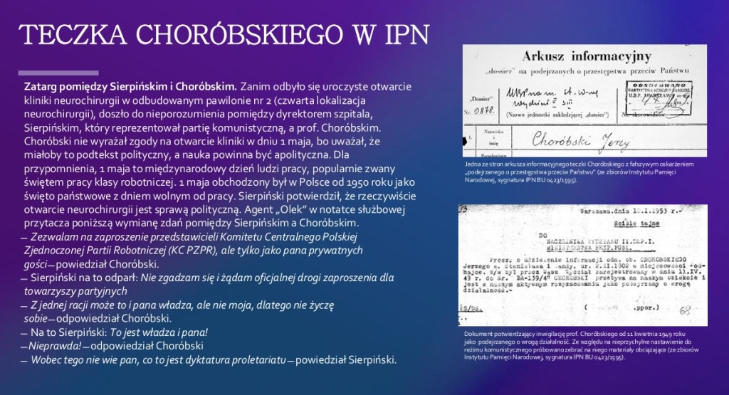 Biografia prof. Jerzego Choróbskiego to pełne pasji i dramatów życie profesjonalne i początki polskiej chirurgii mózgu. Równie wiekopomna była jego rola w zbrojnej walce o polską rację stanu.